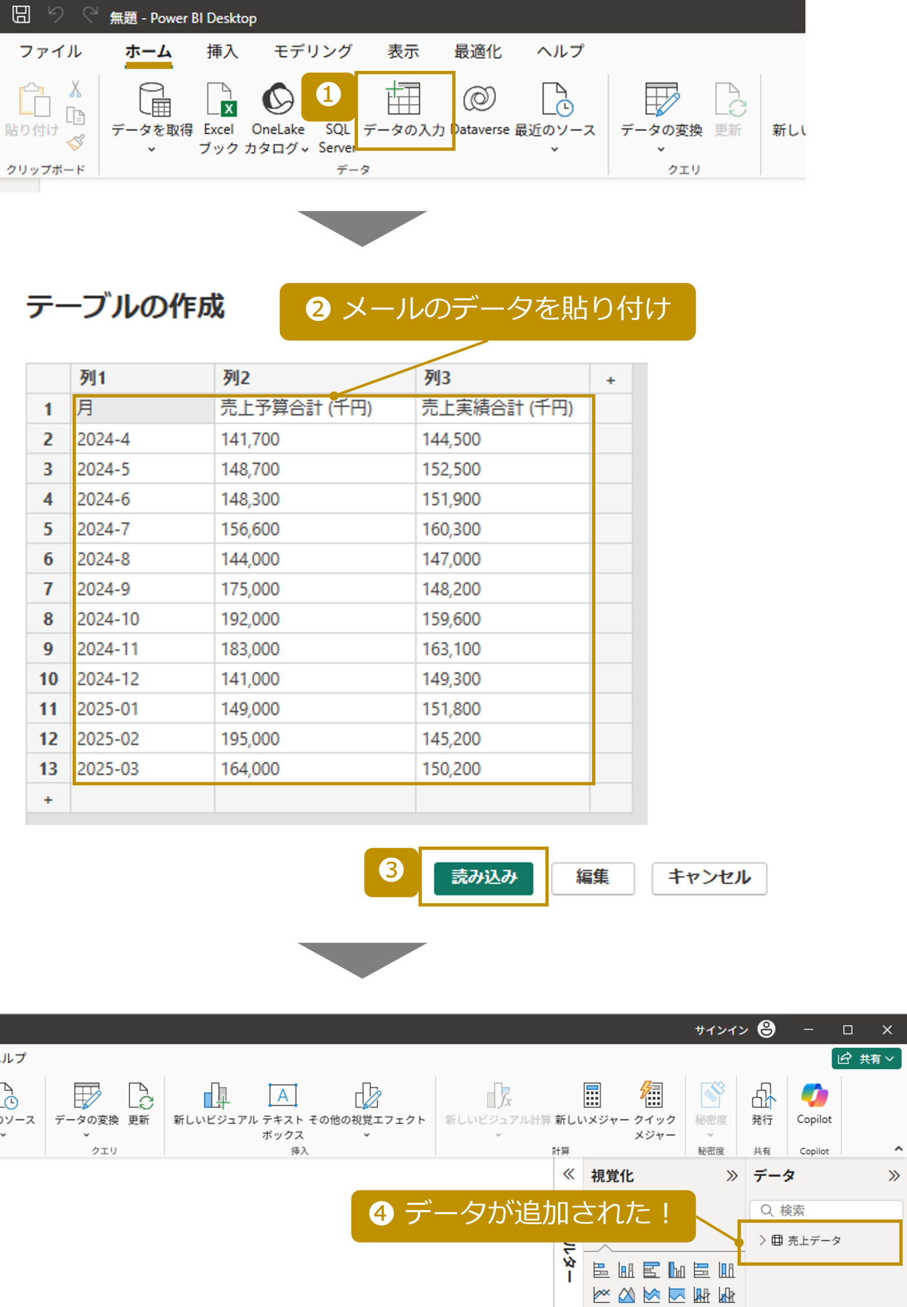今回はデータがメールに直接貼られていたため、データの直接入力 で対応します。Power BIを立ち上げ、メールで送られてきたデータを取り込んでいきます。