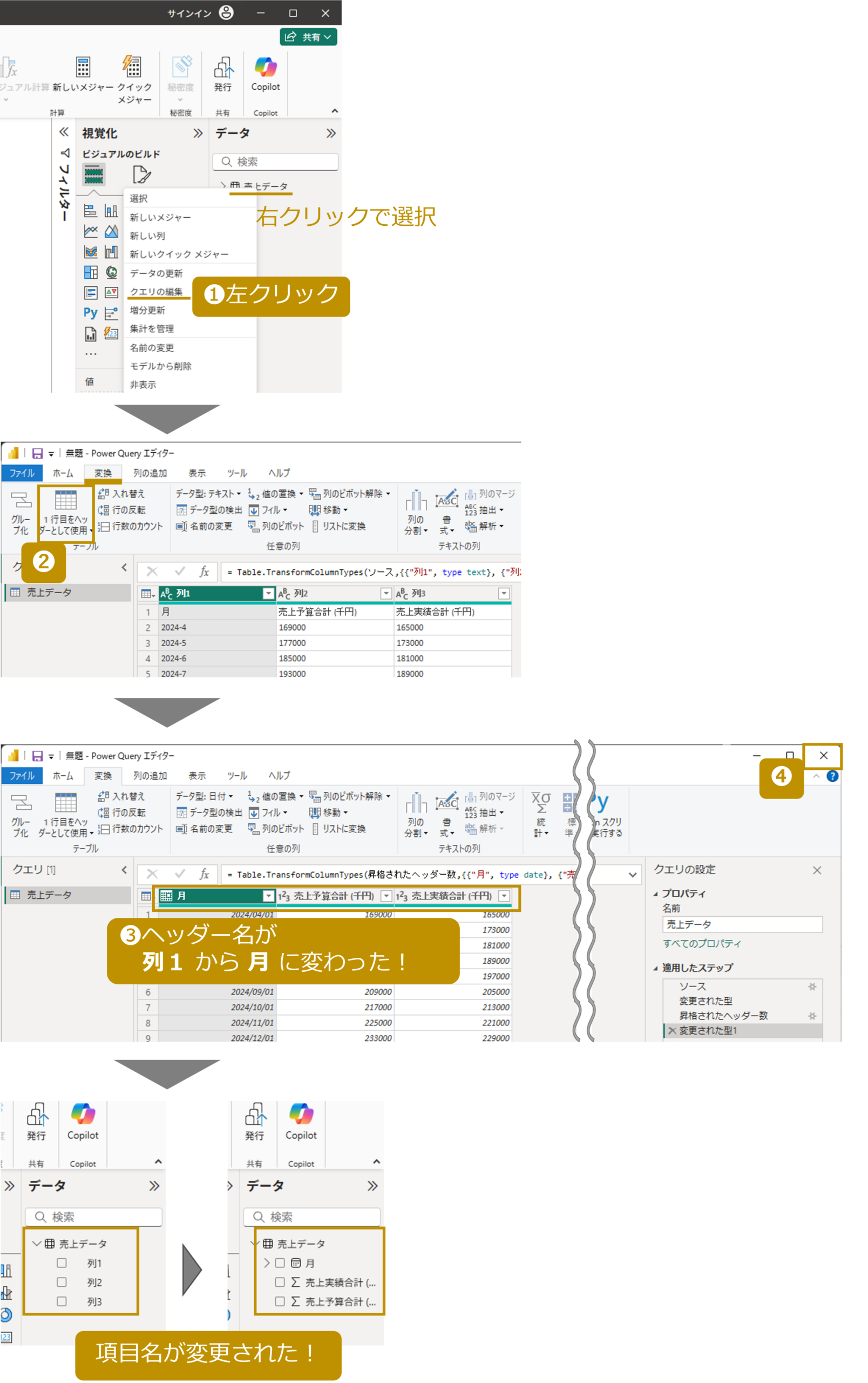 - 月 や 売上予算合計 などの項目名が 正しくヘッダーとして設定された ことを確認