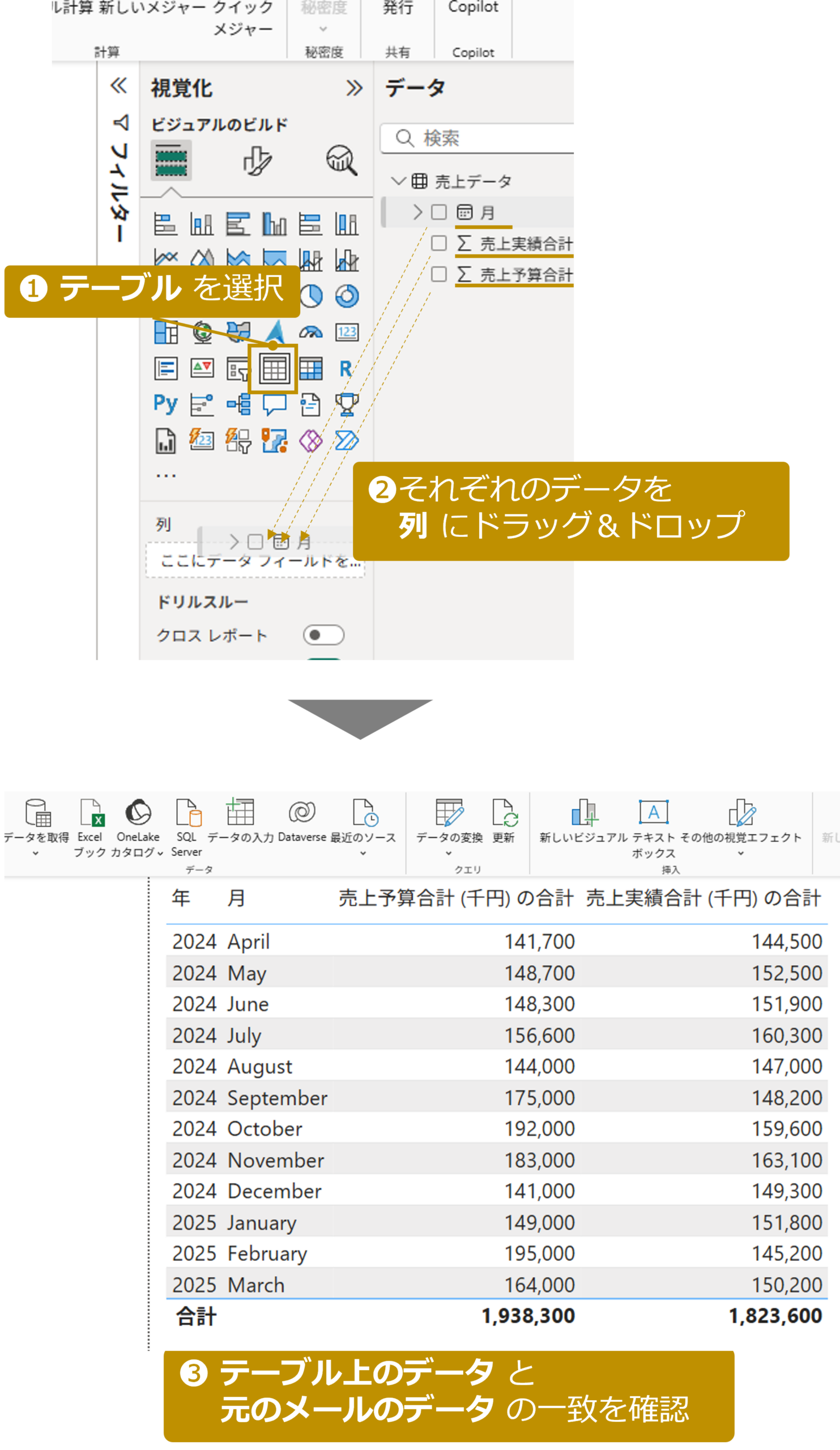 - 「列」 に 月 , 売上予算合計 , 売上実績合計 を ドラッグ&ドロップ