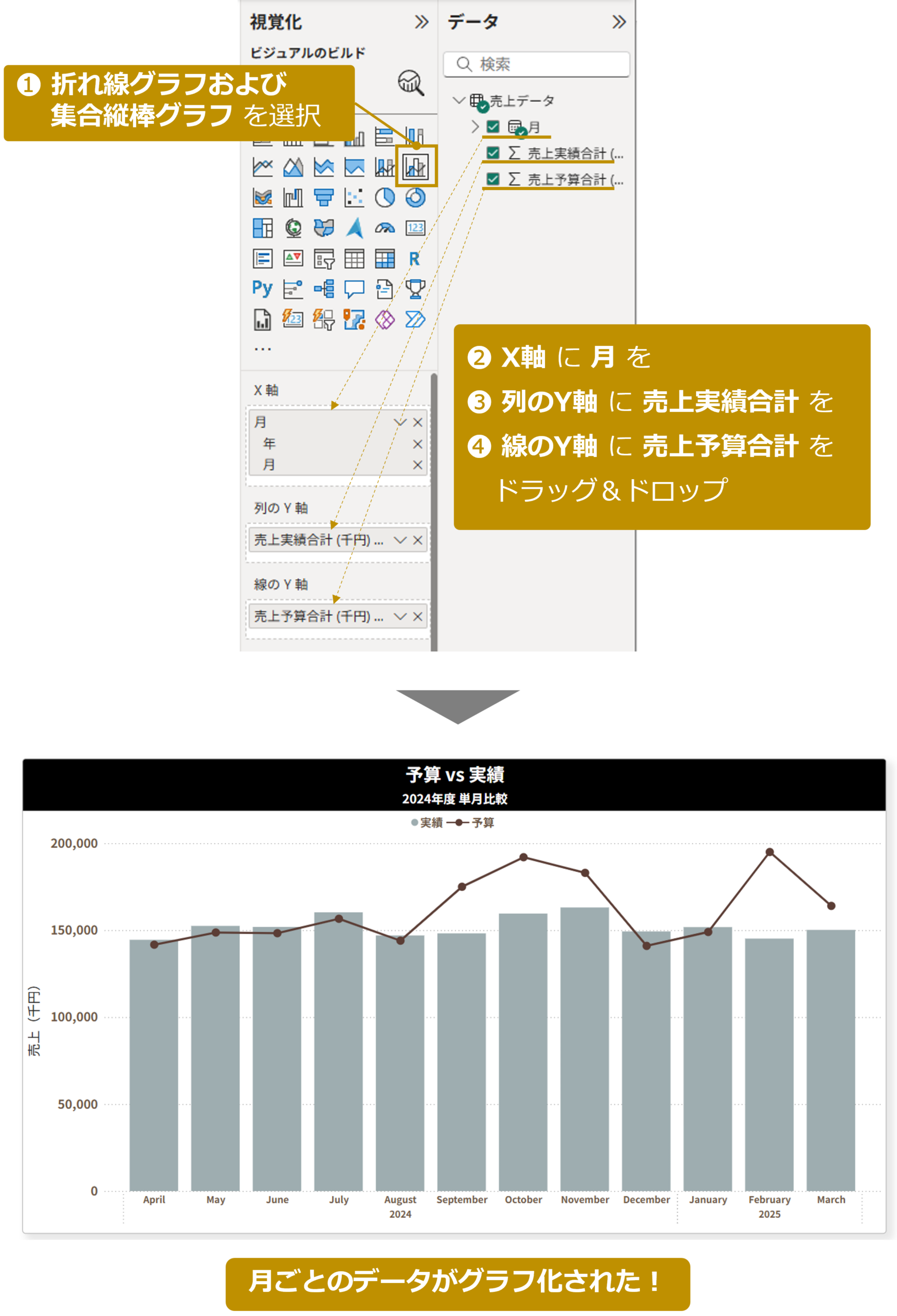 Power BIの強みを活かして、予算と実績を一目で把握できるグラフを作成します。